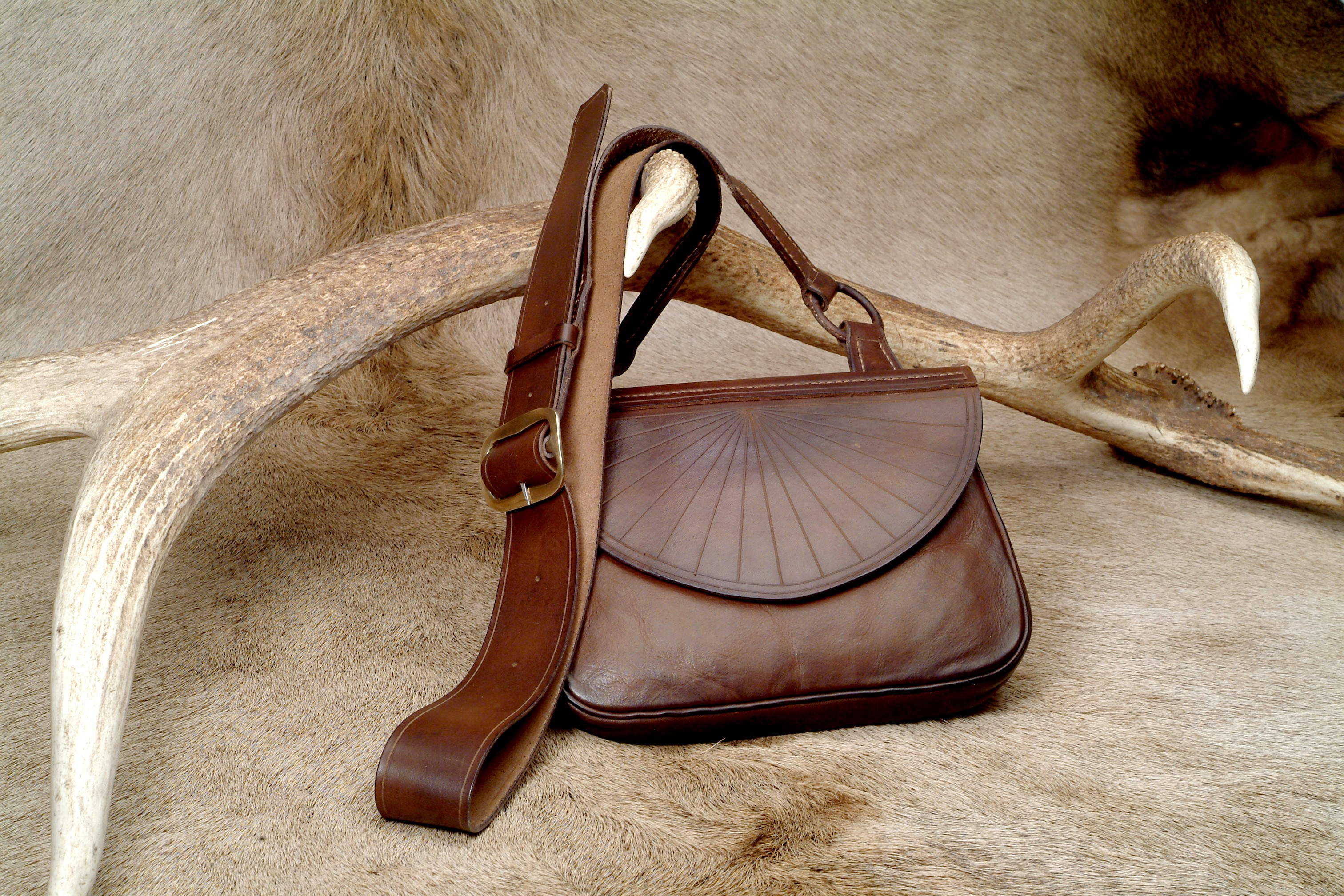 beaver tail flap. This bag is also made of calf skin with a hand cut scallop design. The sunburst bag on the right is hand